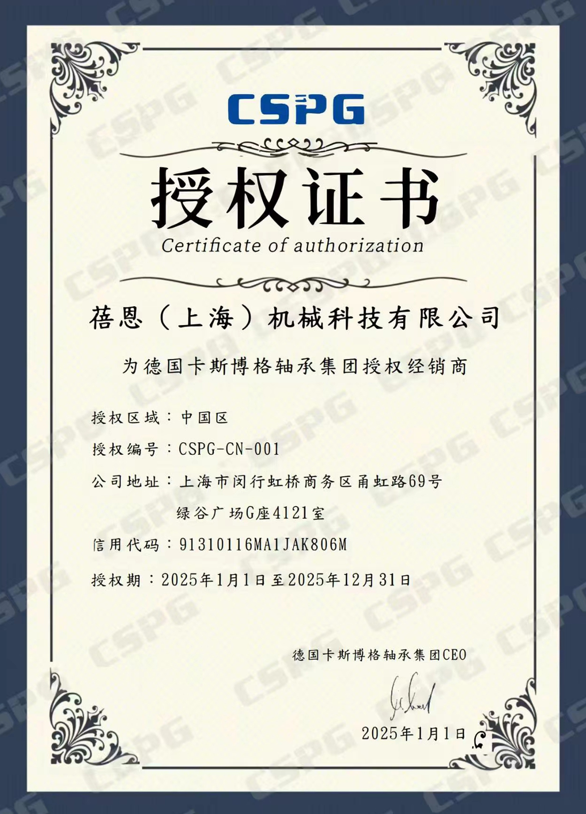 蓓恩機械2025年繼續(xù)獲得CSPG(精密主軸軸承/高速電主軸)授權(quán)